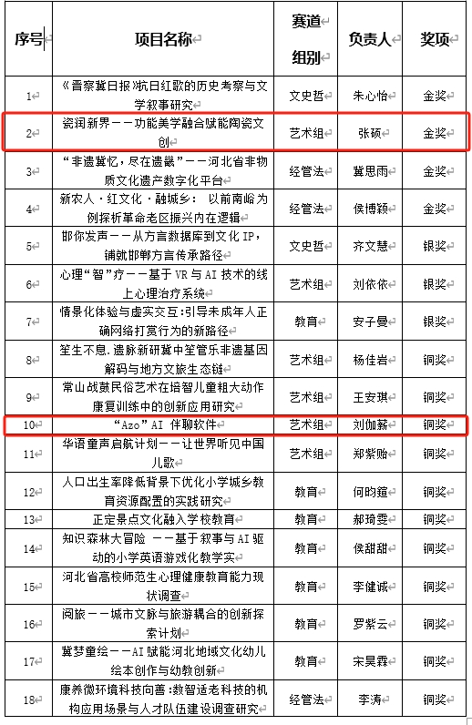 22级工业设计专业刘伽薪同学带队的作品《“Azo” AI 伴聊软件》以新颖的设计思路、贴合需求的功能定位,荣获艺术组铜奖。在郭倩老师的指导下,该作品聚焦当下社会情感陪伴需求,将 AI 技术与设计美学相结合,打造出兼具实用性与人文关怀的软件产品,体现了学生敏锐的市场洞察力与跨界创新思维。
