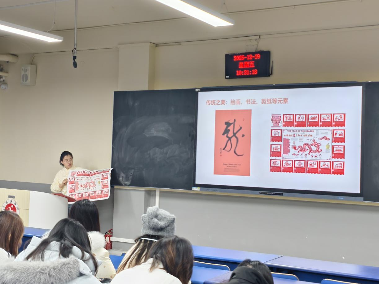 王老师在讲座中以中国英文媒体China Daily春节特刊为研究案例,结合春节被列为联合国假日且入选联合国教科文组织人类非物质文化遗产代表作名录这一国际背景,从新闻传播学与视觉传达学的交叉视角出发,系统剖析了春节文化在国际传播中的视觉框架、图像叙事以及传播策略。并将议程设置与框架理论引入定量与定性的学术研究之中,对该议题的学术研究思路、研究方法以及论证逻辑进行了深入阐释,助力学生理解如何将视觉案例转化为规范且可论证的学术研究。