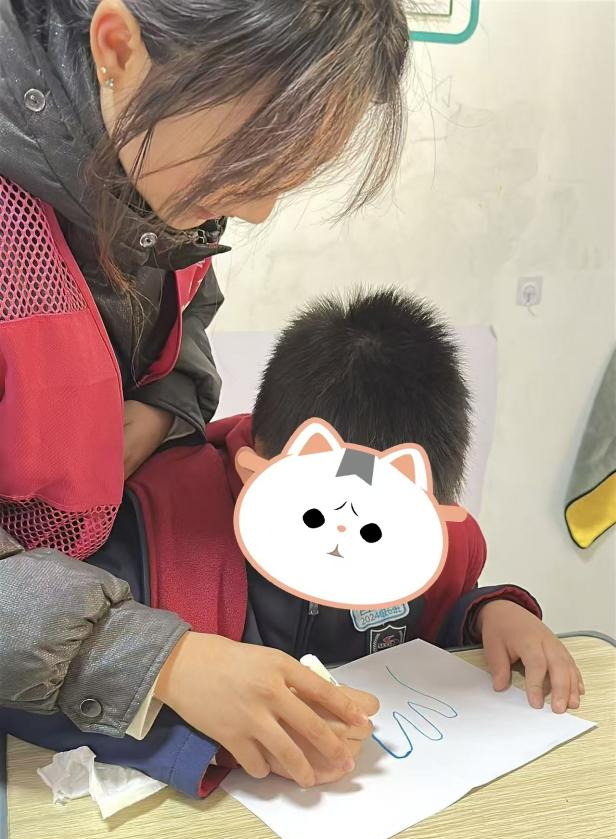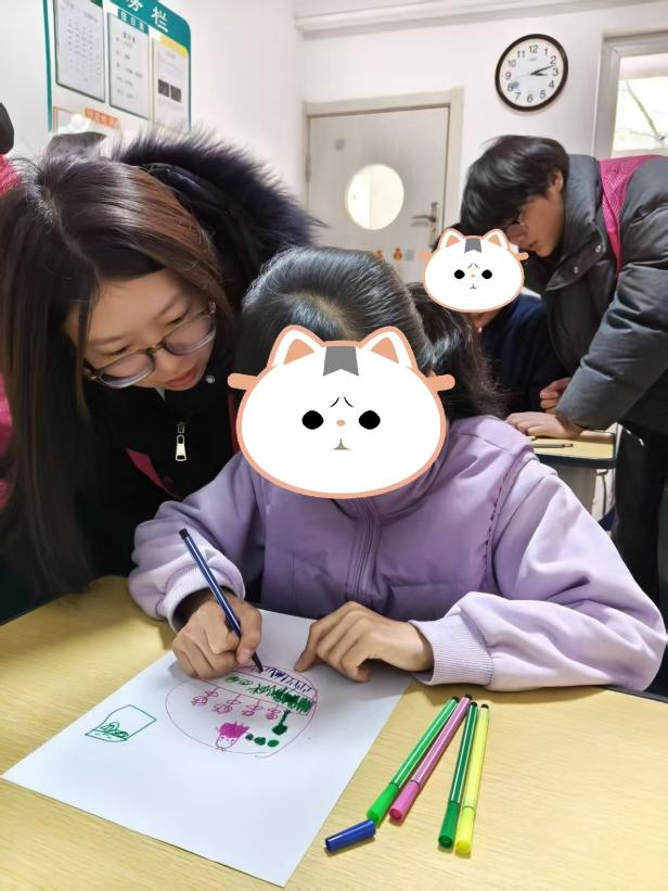 课程现场采用“一对一陪伴制”,每位实践队员都化身为专属的“临时伙伴”,全程耐心引导孩子们参与创作。孩子们在画纸上大胆地勾勒线条、涂抹色彩,用色彩表达内心的情感世界,将心中的美好图景呈现在纸面上,每一笔色彩都承载着纯粹的童真。